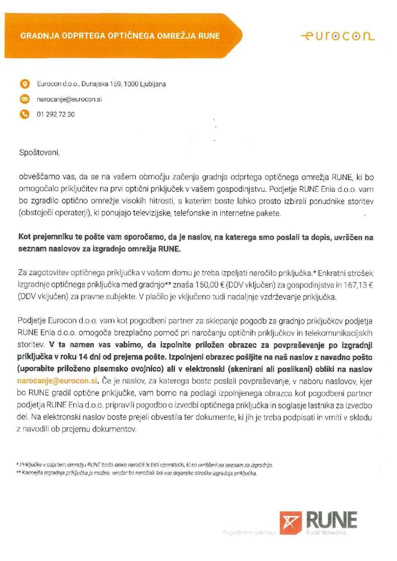 V poštne nabiralnike ste prejeli Ponudbo za gradnjo odprtega optičnega omrežja RUNE katerega cilj je zagotavljati ultra hitro širokopasovno optično infrastrukturo vsem uporabnikom na podeželskih področjih v Sloveniji. Torej tistim, ki internetnega dostopa v tem tisočletju še nimate in tudi tistim, ki ga že imate, pa bi želeli z optiko doseči veliko hitrejši prenos (večje od 1 Gb/s). Gre za enkratno naložbo vsakega gospodinjstva posebej, vaš ponudnik internetnih storitev pa ostaja isti oz. si ga izbirate sami kot do sedaj.