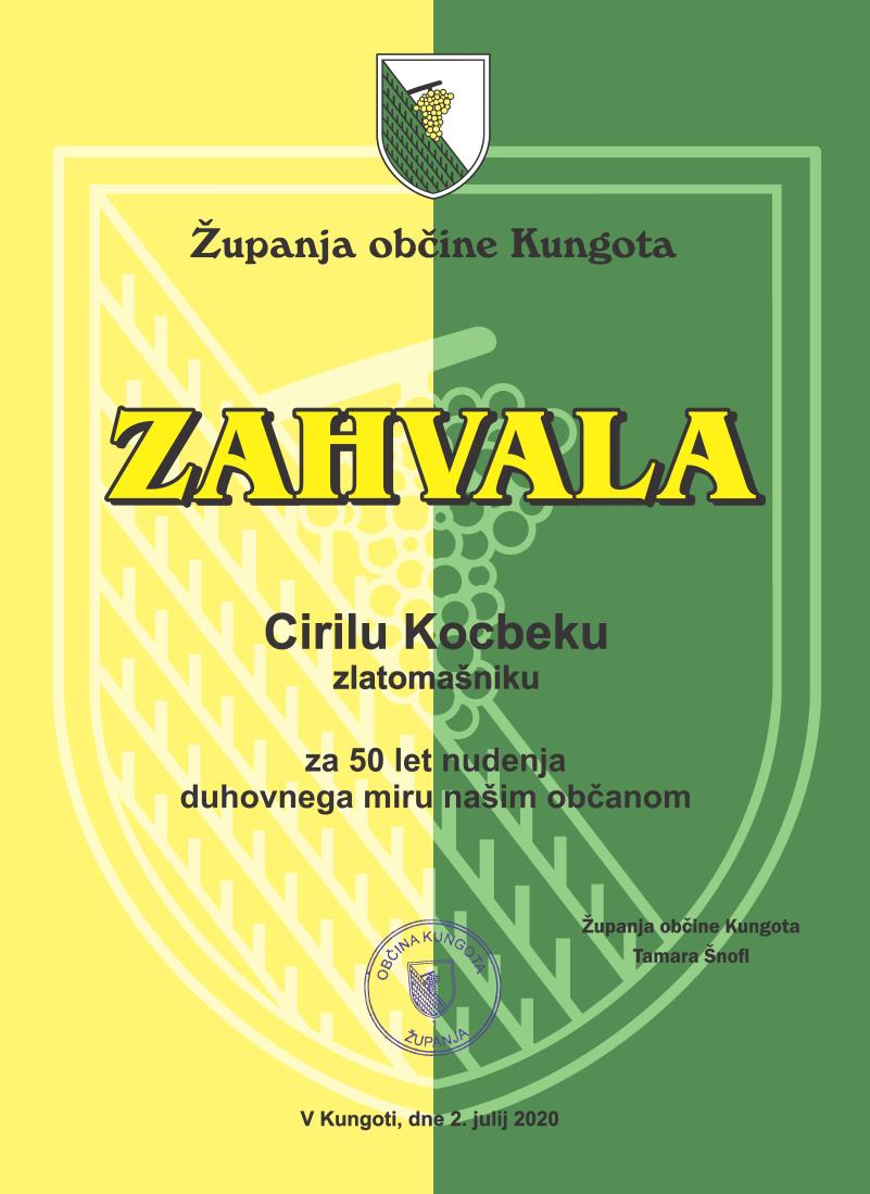 V četrtek, 2. 7. 2020 je županja Tamara Šnofl gostila gospoda župnika, Cirila Kocbeka, zlatomašnika. Ob častitljivem jubileju mu je čestitala in se zahvalila za 50 let nudenja duhovne oskrbe občanom Kungote, pa tudi za aktivno sodelovanje v številnih društvih tekom let.
