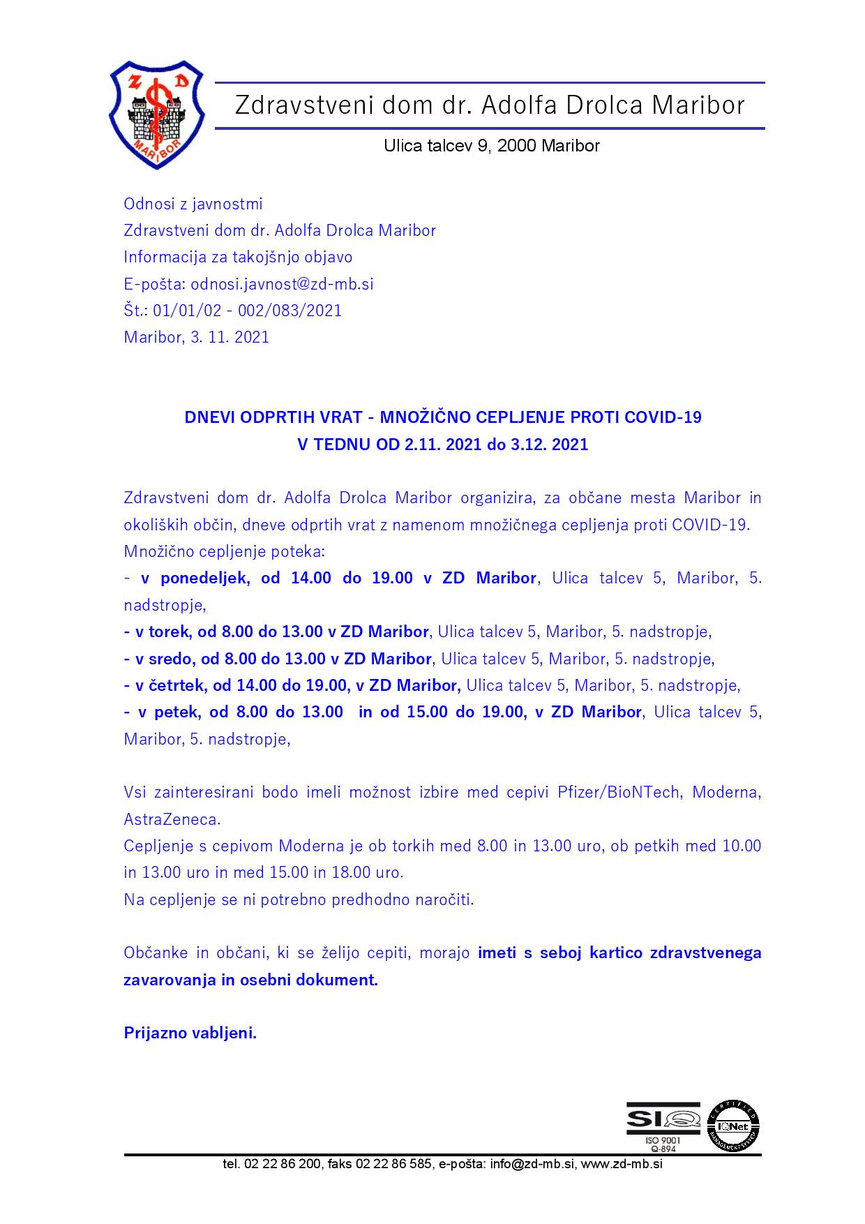DNEVI ODPRTIH VRAT - MNOŽIČNO CEPLJENJE PROTI COVID-19