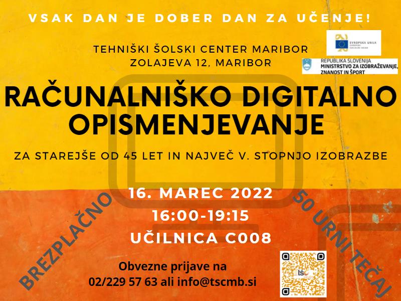TEHNIŠKI ŠOLSKI CENTER MARIBOR vabi v aktualni program BREZPLAČNEGA usposabljanja Računalniško digitalno opismenjevanje (RDO)*!